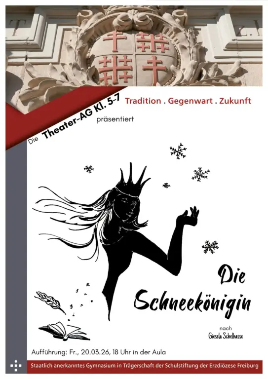 Am Fr., 20.03.2026, um 18 Uhr führt die Theater-AG Kl. 5-7 das Stück „Die Schneekönigin“ nach Giesela Schelhasse in der Aula auf.