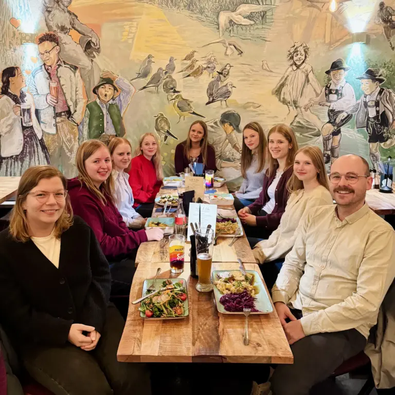 Nach der Führung war der Hunger wieder groß und an diesem letzten Abend ging es für uns in ein asiatisches Restaurant mit ausschließlich veganen Speisen. Nach dem leckeren Essen und unseren lustigen Gesprächen machten wir uns wieder auf den Weg ins Nationaltheater – diesmal nicht mehr im leeren Saal wie bei der Führung, sondern mitten unter mehr als 2000 anderen Zuschauern. Denn der letzte Abend hatte es noch einmal so richtig in sich. Der Plan war nämlich, gemeinsam die moderne Ballettinszenierung „Waves and Circles“ zu besuchen. Unsere Plätze lagen im 2. Rang, was bedeutete, dass wir perfekt von oben zuschauen und die Choreografie genießen konnten. Das Ballett war ebenfalls sehr beeindruckend und die Tänzerinnen und Tänzer zeigten auf faszinierende Weise, wie die Emotionen der Musik im Tanz verdeutlicht und ausgedrückt werden können. Mit diesem Erlebnis des letzten Abends fuhren wir mit der Bahn in die Jugendherberge, um dort unsere Koffer zu packen. Denn am nächsten Tag hieß es für uns leider, Abschied von der schönen Stadt zu nehmen.