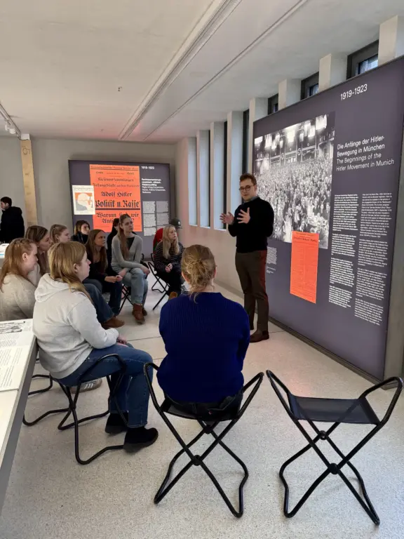 … schliefen wir, wie es sich gehört, aus, denn wir mussten erst um 10 Uhr los. Nach dem wie immer leckeren und gemütlichen Frühstück machten wir uns auf den Weg, um das am berühmten Königsplatz liegende NS-Dokumentationszentrum zu besuchen. Schon beim Ankommen merkten wir, dass diese Gegend ein bedrückendes Gefühl in uns auslöste, da man teilweise an Häusern noch Spuren aus der NS-Zeit erkennen konnte. In der Nähe befindet sich auch die heutige Musikhochschule, früher der sogenannte „Führerbau“, in dem 1938 unter anderem das Münchner Abkommen unterzeichnet wurde. Dort schauten wir uns kurz um und erkannten die Kulisse direkt wieder, da in diesem Gebäude bekannte Filme gedreht worden waren – zum Beispiel die Komödie „Fack ju Göhte 2“, aber auch der historische Netflix-Film „München – Im Angesicht des Krieges“, der sich mit dem Münchner Abkommen beschäftigt.