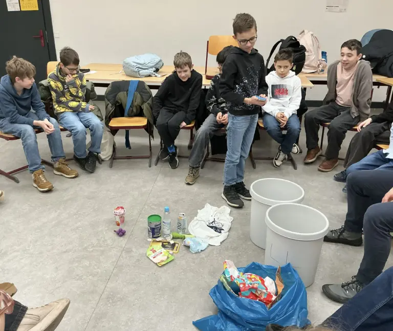 Zu Beginn gab es noch einiges an Vorbereitung. Auf dem Boden wurden verschiedene Arten von Müll (z.B. Plastik-, Papier-, Bio- und Restmüll) verteilt und davor vier entsprechende Mülltonnen (für Plastik-, Papier-, Bio- und Restabfall). Die erste Übung war folgende: Wir mussten etwas von dem Müll nehmen und in die richtige Tonne werfen. Diese Übung war sehr hilfreich und interessant. Wir haben auch Wichtiges über die Entsorgung gelernt.